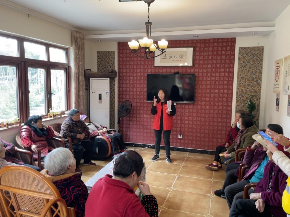 学生黄莉莉为老人分享健康养生小知识,帮助老人在日常生活更好的维护自己的健康。