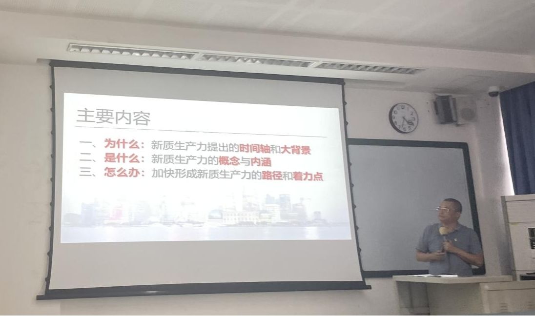 党委书记岳敏于明德楼203室为2023级社会工作学生讲授了“加快形成新质生产力,推动经济高质量发展”的思想政治理论(专题)课,从“是什么”“为什么”“怎么办”三个维度展开,为大家详细介绍了新质生产力提出的时间轴和大背景、新质生产力的概念与内涵以及加快形成新质生产力的路径和着力点。