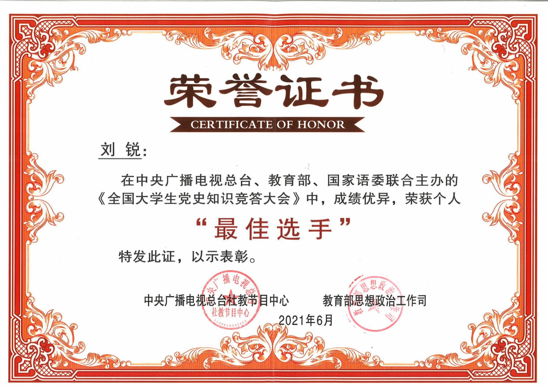 荣获由教育部、中央电视总台联合颁发的《全国大学生党史知识竞答大会》团体“二等奖”,国产无码