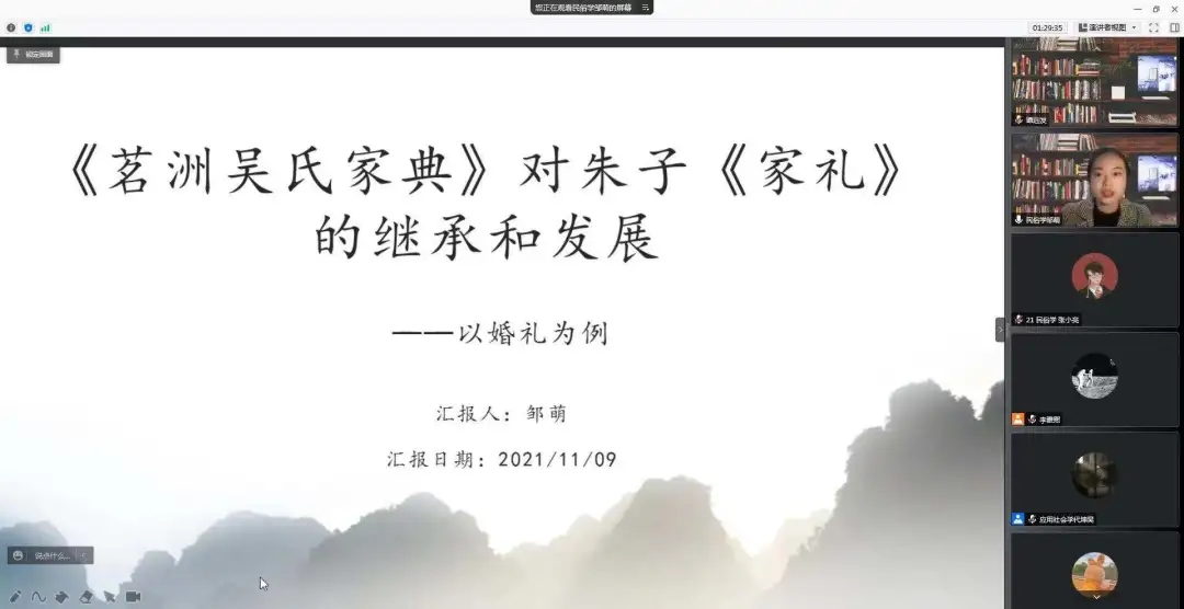 在分论坛二,邹萌、吴汉、张心意、熊晨等4名同学分别就《< 茗洲吴氏家典>对朱子< 家礼>的继承和发展——以婚礼为例》、《A Comparative Study of Caregiving Experiences between Family Caregivers of Elderly Cancer Patients in China and India A Qualitative Meta-synthesis》、《权变视角下李村兼农业工人产生及发展研究——从意外后果到理性行为的逻辑分析》、《情感支持与西部农村青少年校园欺凌》进行了汇报分享。