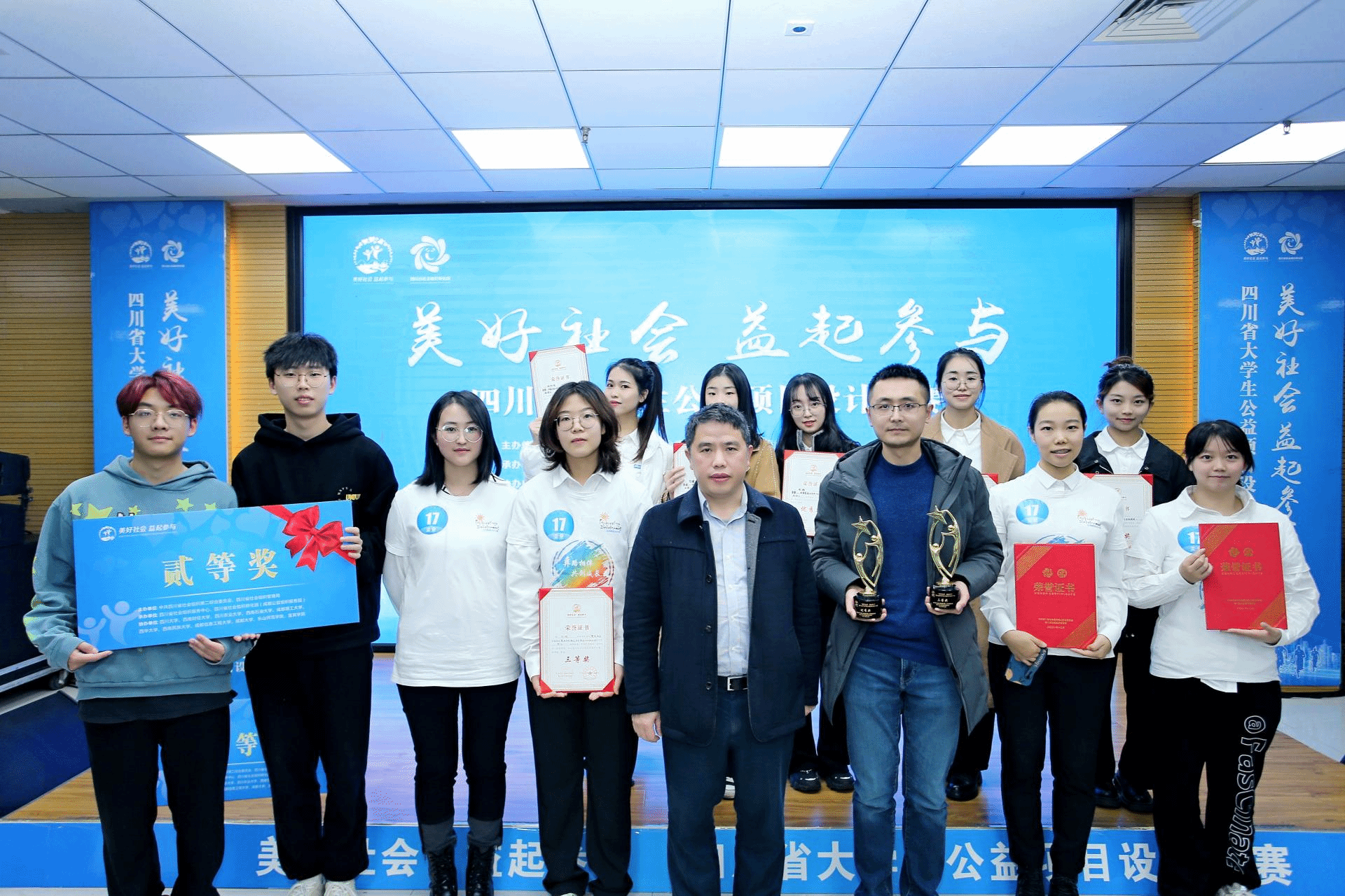 三支参赛团队凭借着出色的答辩能力和扎实的专业功底,全部进入前10。“以爱之名与家同行”计划生育特殊家庭关爱项目荣获二等奖,“彝路相伴,共创成长”彝族易地搬迁社区青少年正向成长计划荣获三等奖,童盟——涉毒家庭未成年子女正向成长项目荣获优秀奖,三个获奖团队的指导教师周祝丰、周正、张琼文获优秀指导教师奖。