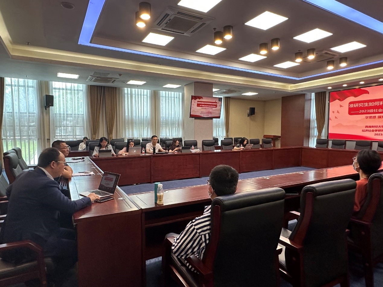 谭远发教授首先阐明了今天活动的目的,帮助准研究生高效利用暑期,实现本科到研究生的顺利过渡,提高人才培养质量,介绍了出席活动各位老师和同学,特别介绍了2023级社会经济学专业的招生情况,推免录取5人,公招4人,总共是9人,考录比为10:1,并对9位成功上岸的硕士研究生表达热烈的祝贺,并就大家关心的选导师事宜做了简要说明。